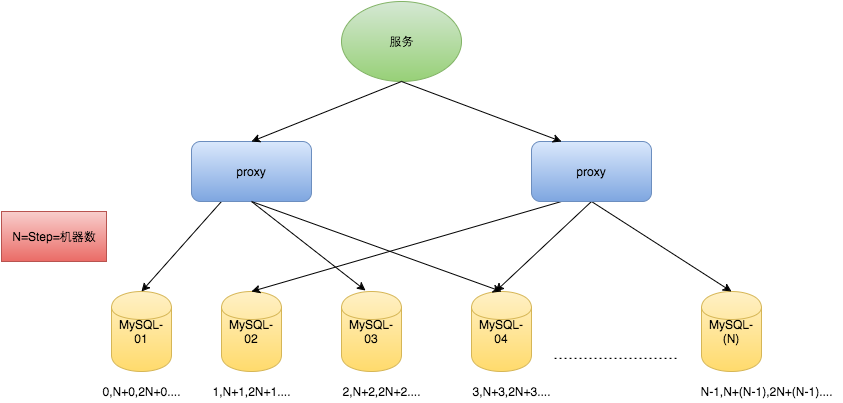 假设我们要部署 N 台机器,步长需设置为 N,每台的初始值依次为 0,1,2…N-1 那么整个架构就变成了如下图所示: