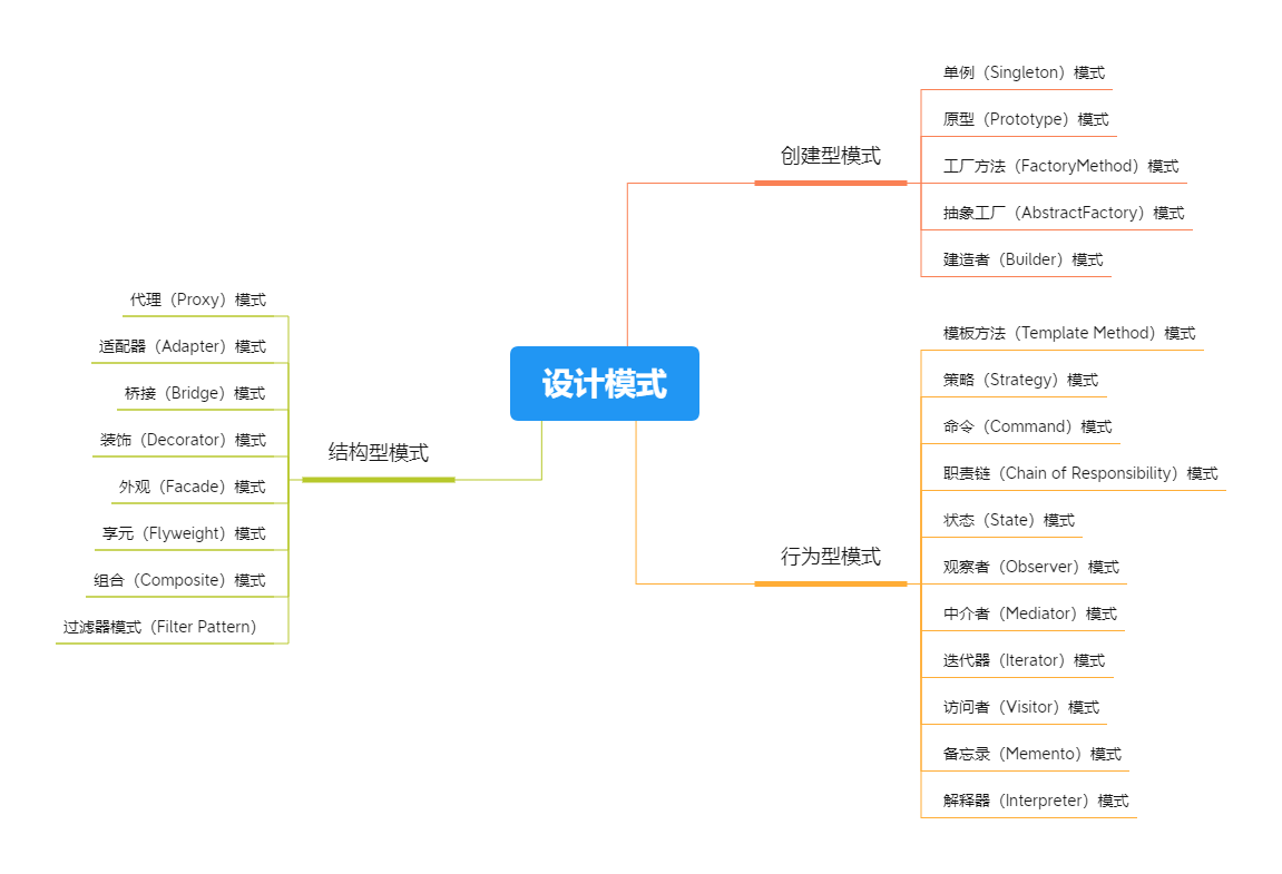 设计模式是遵守设计原则,在软件开发中发现的重复编码模式,目前存在非常多的设计模式,更好的分类能够加深对模式的理解。Gof 将模式分成三个不同的类目:创建型、行为型和结构型,具体的分类细节如下: